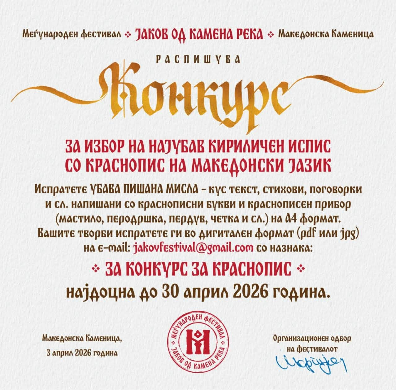 Меѓународниот фестивал „Јаков од Камена Река“ – Македонска Каменица распиша конкурс за избор на најубав кириличен испис со краснопис на македонски јазик, кој и оваа година традиционално го распишува Меѓународниот фестивал „Јаков од Камена Река“ Македонска Каменица.